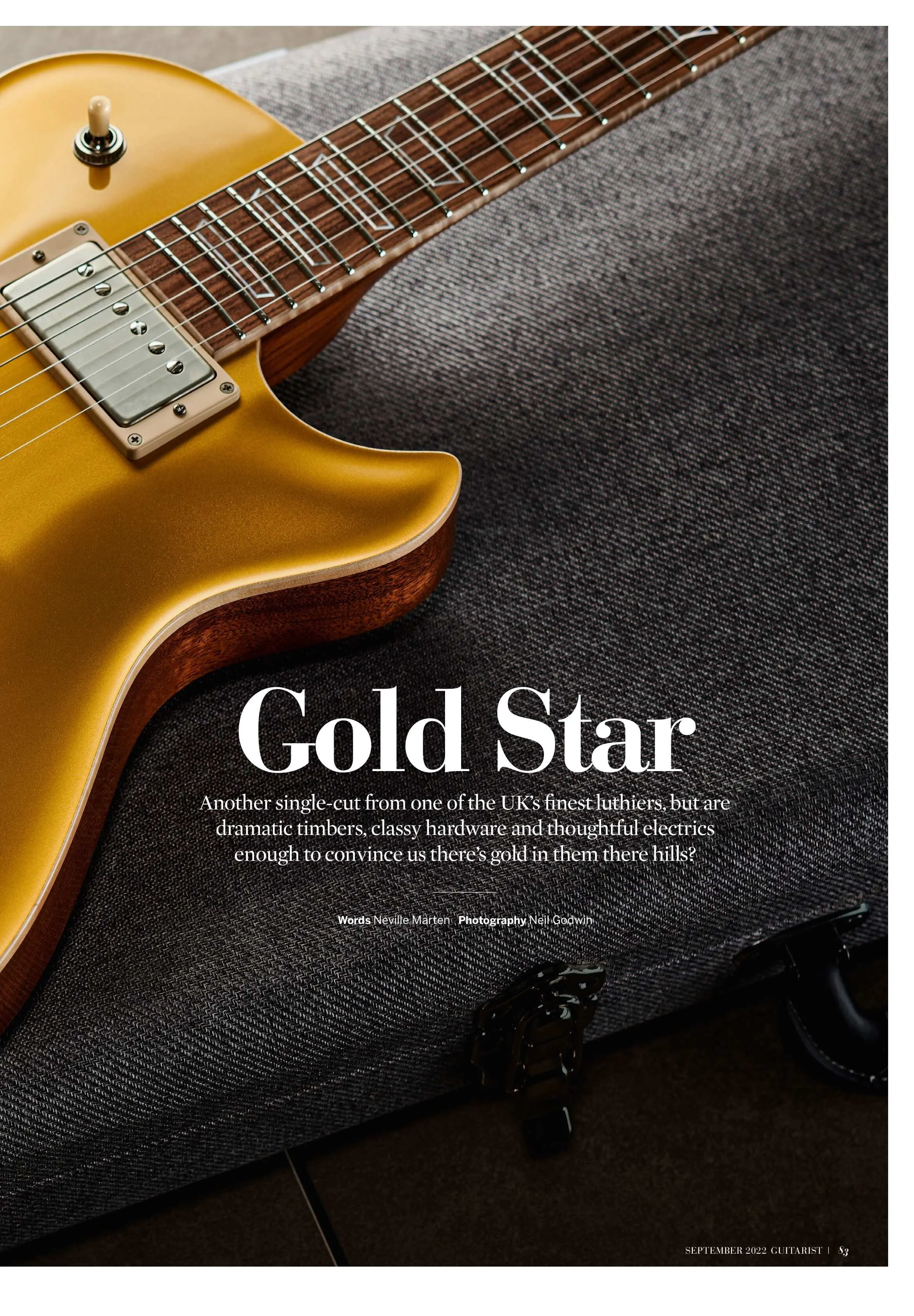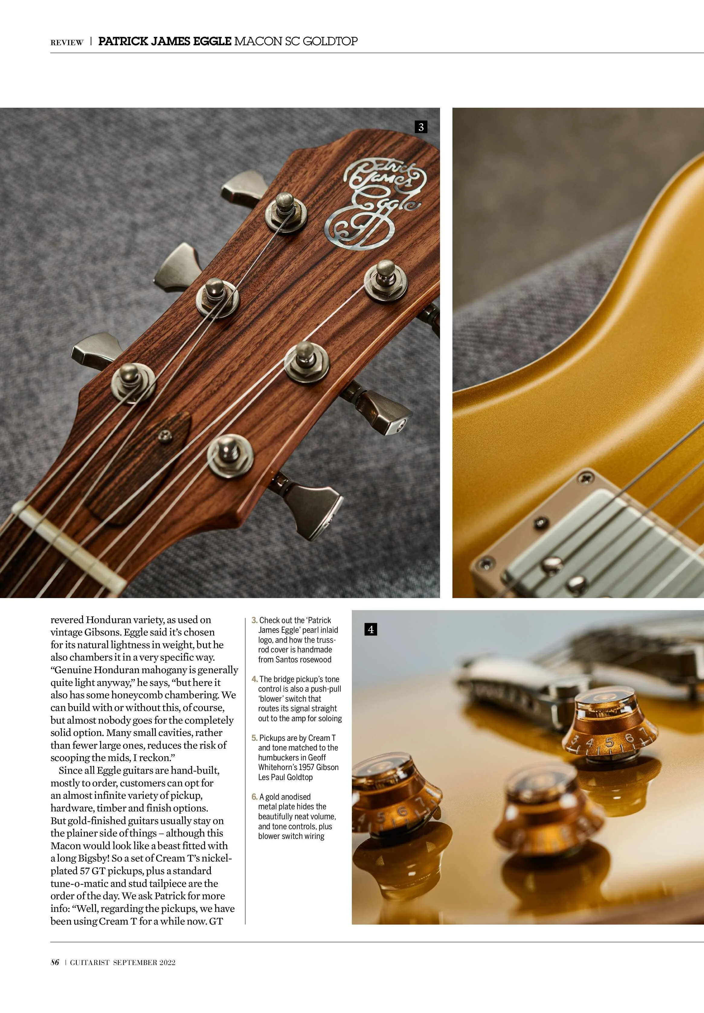 Image of a magazine review page featuring a Patrick James Eggle Macon SC Goldtop electric guitar and a close-up of a guitar headstock with tuning pegs and handwritten details.